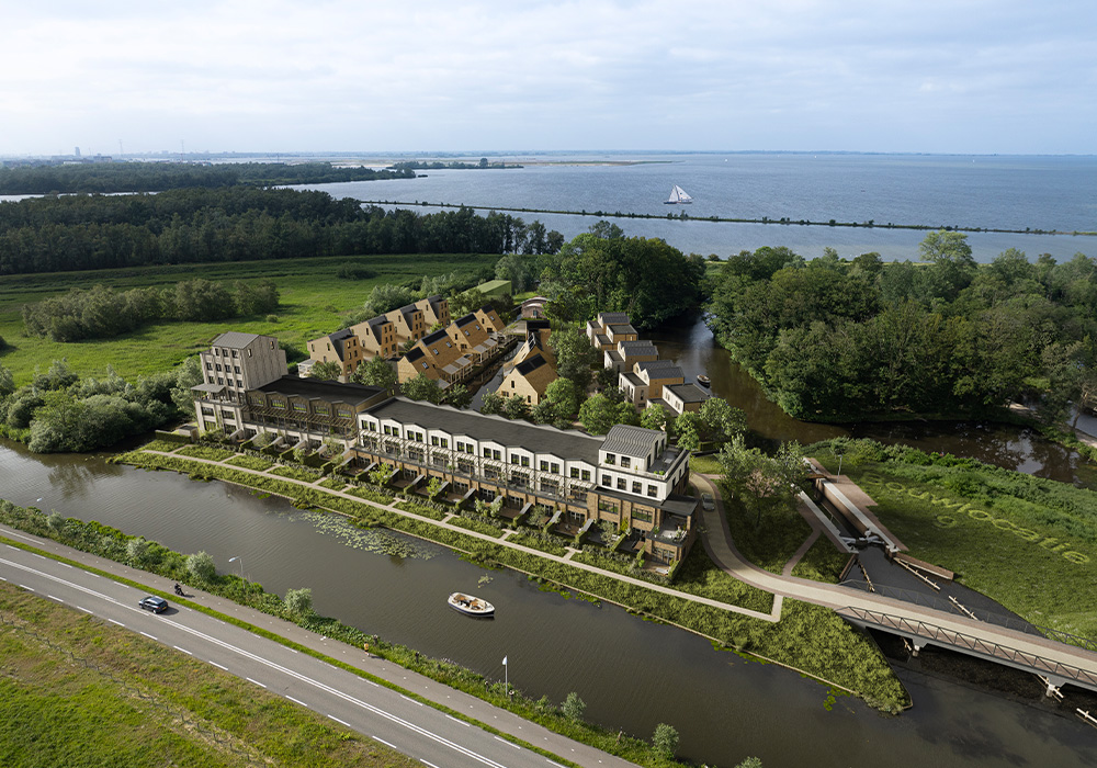 - 8 twee-onder-een-kapwoningen van ca 132 – 148 m2 gelegen aan water met mee ontworpen veranda’s en terrassen