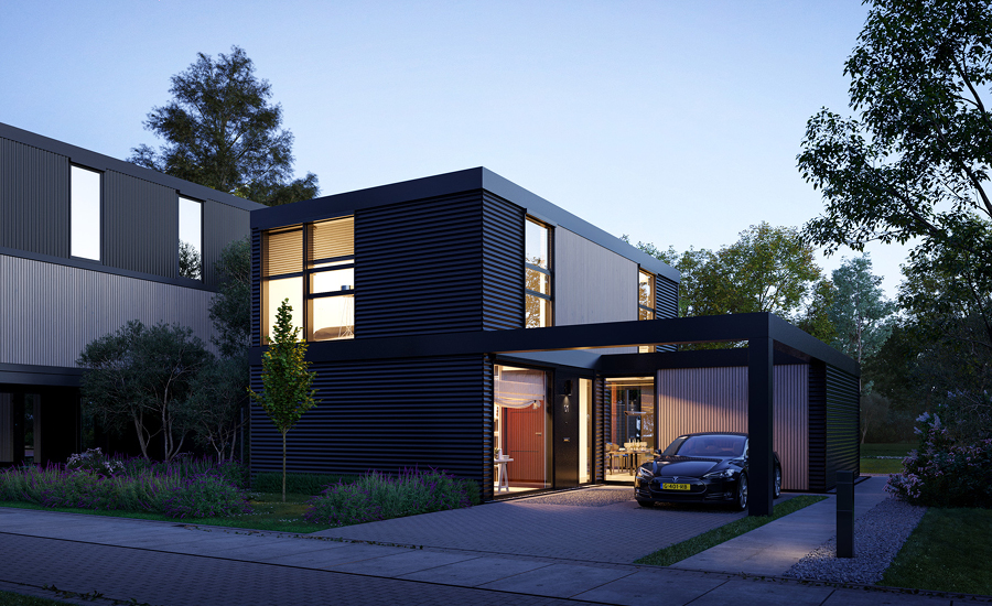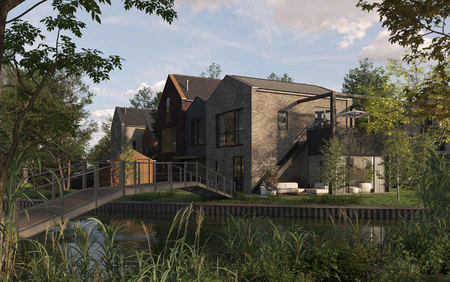 Bosrand: robuuste, pakhuis-achtige villa’s aan een haventje